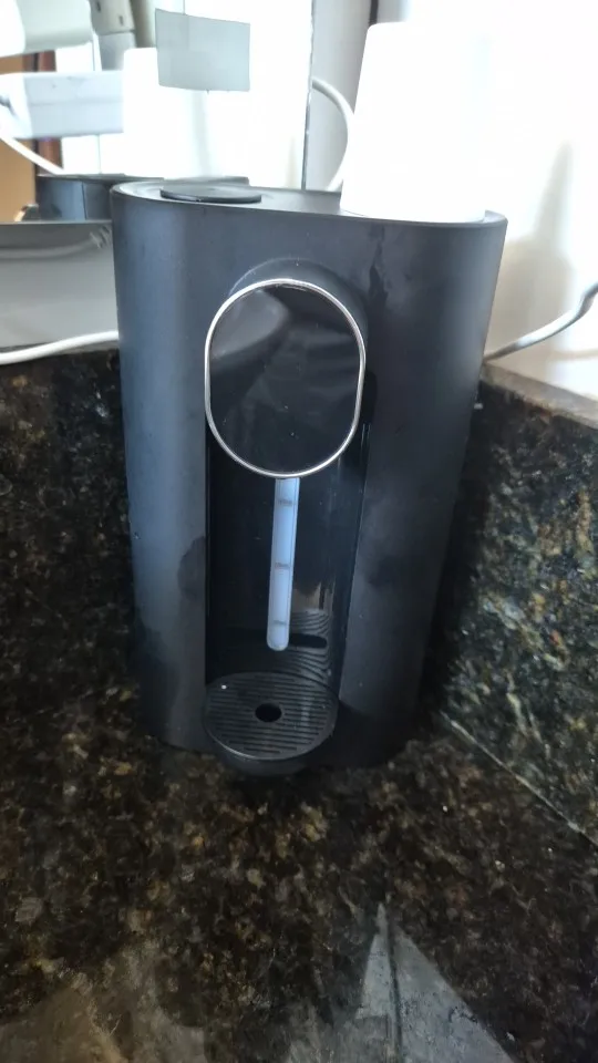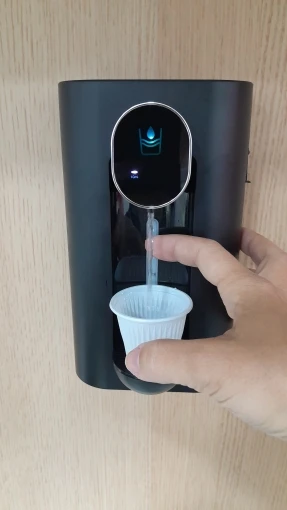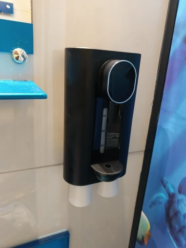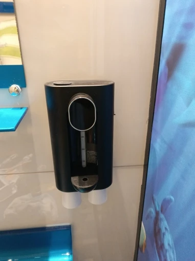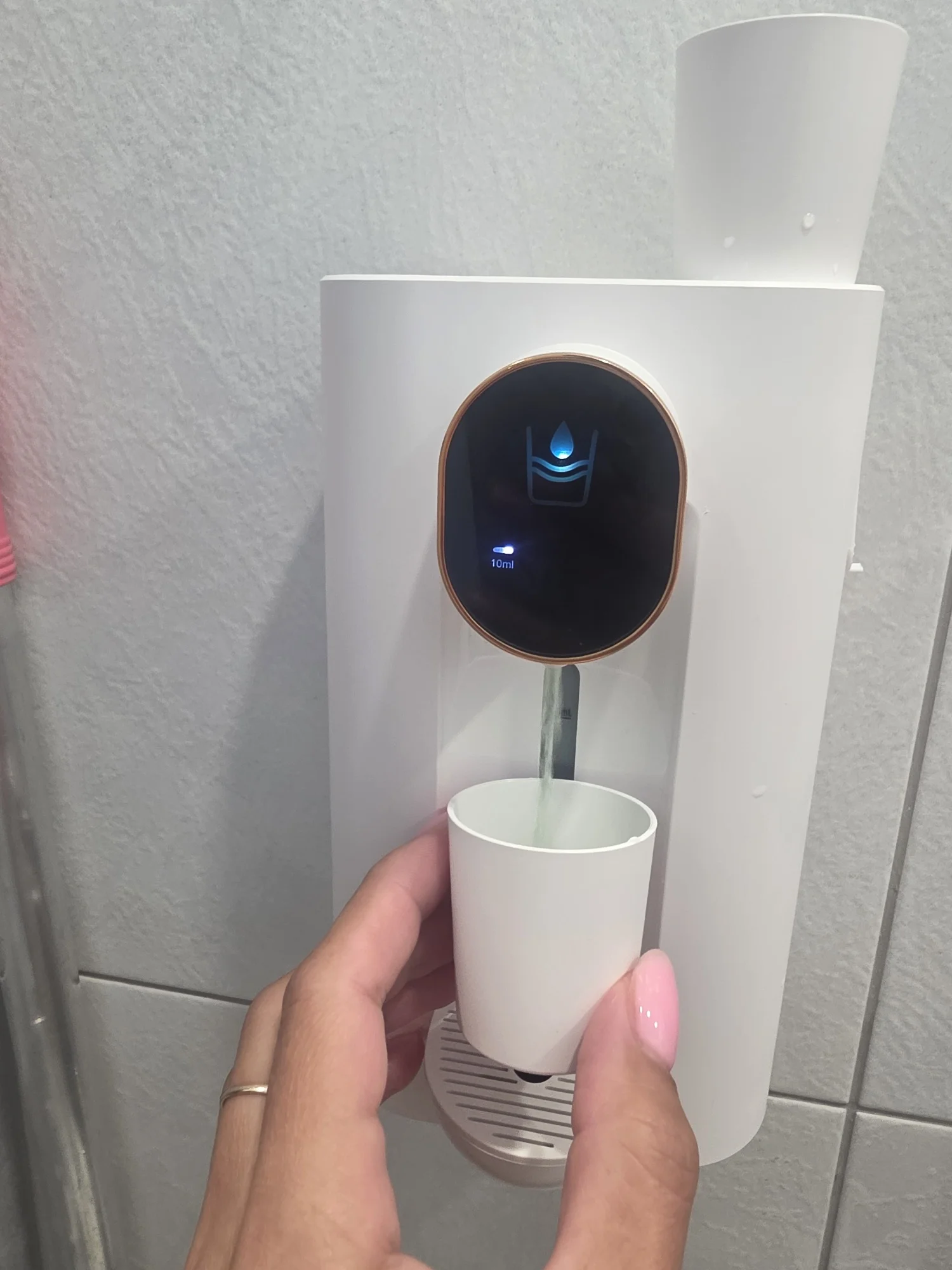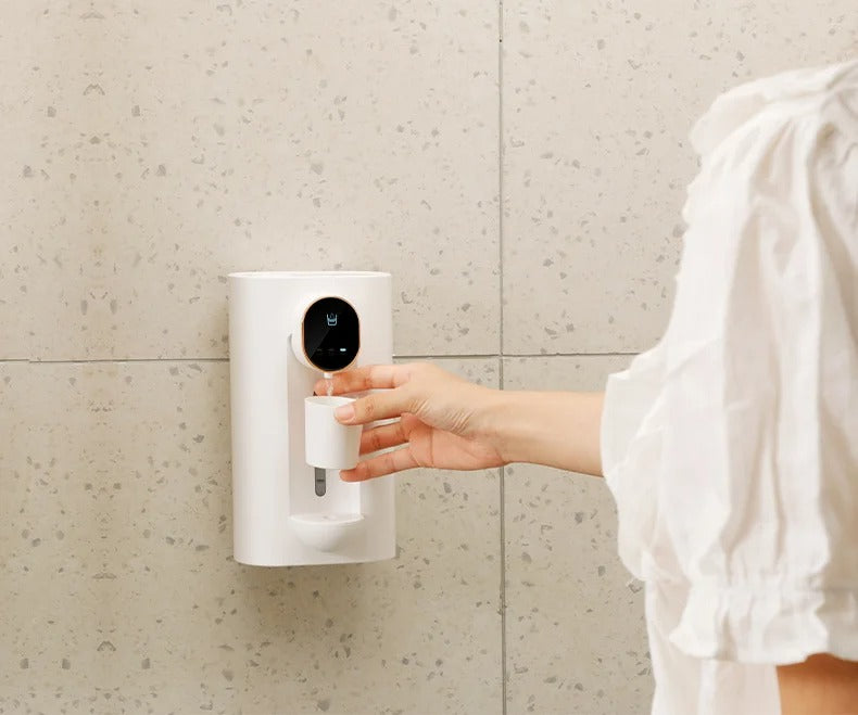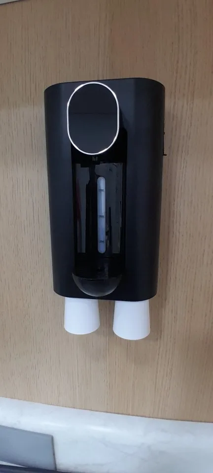 Labelled buttons for selecting different amounts, infrared sensor on the front, and a container visible at the back for holding mouthwash solution.