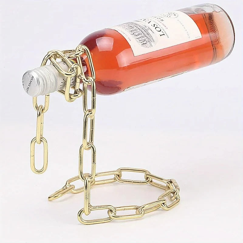 The welded metal chains are designed to cradle the bottle securely, preventing it from tipping over, rolling, or falling.