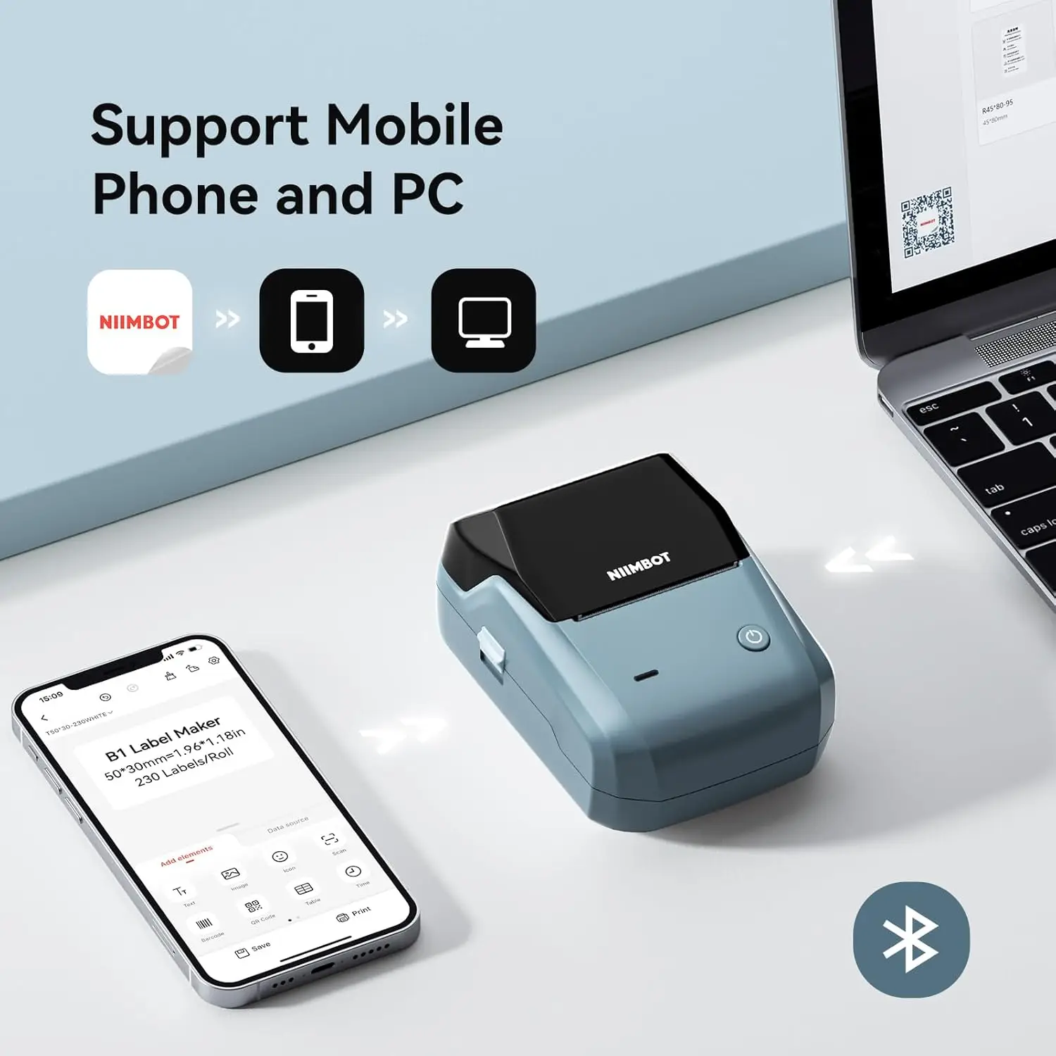 - 📱 Easy Connectivity: Compatible with iOS and Android via the NIIMBOT app. Connect effortlessly via Bluetooth or USB for PC.