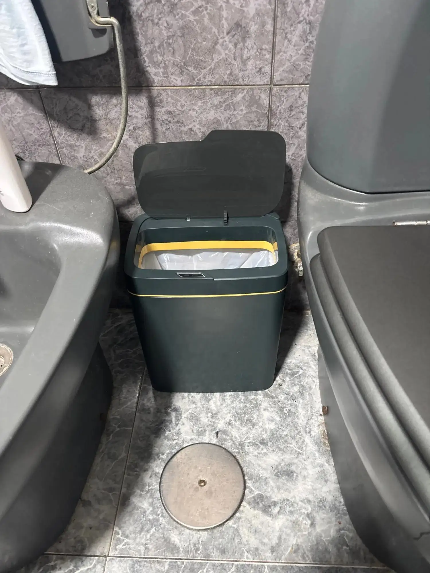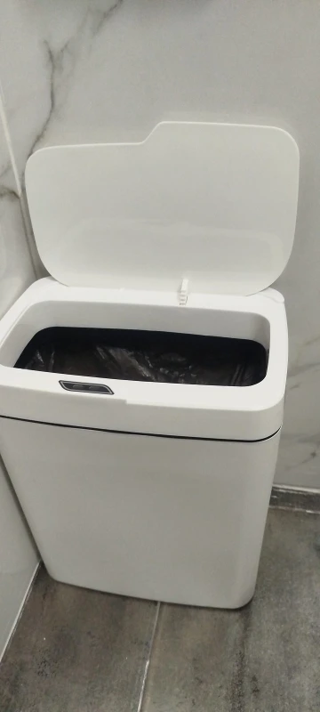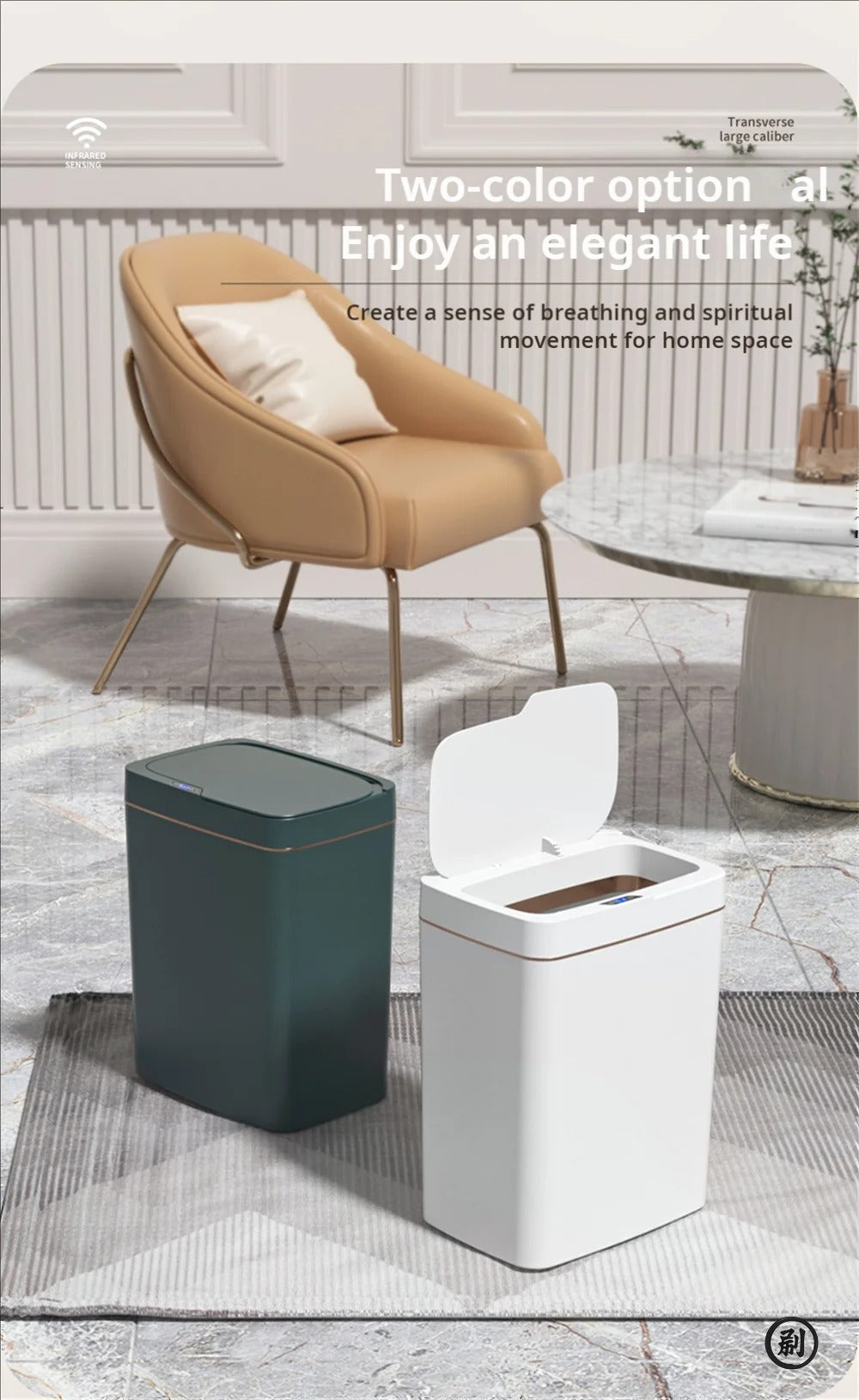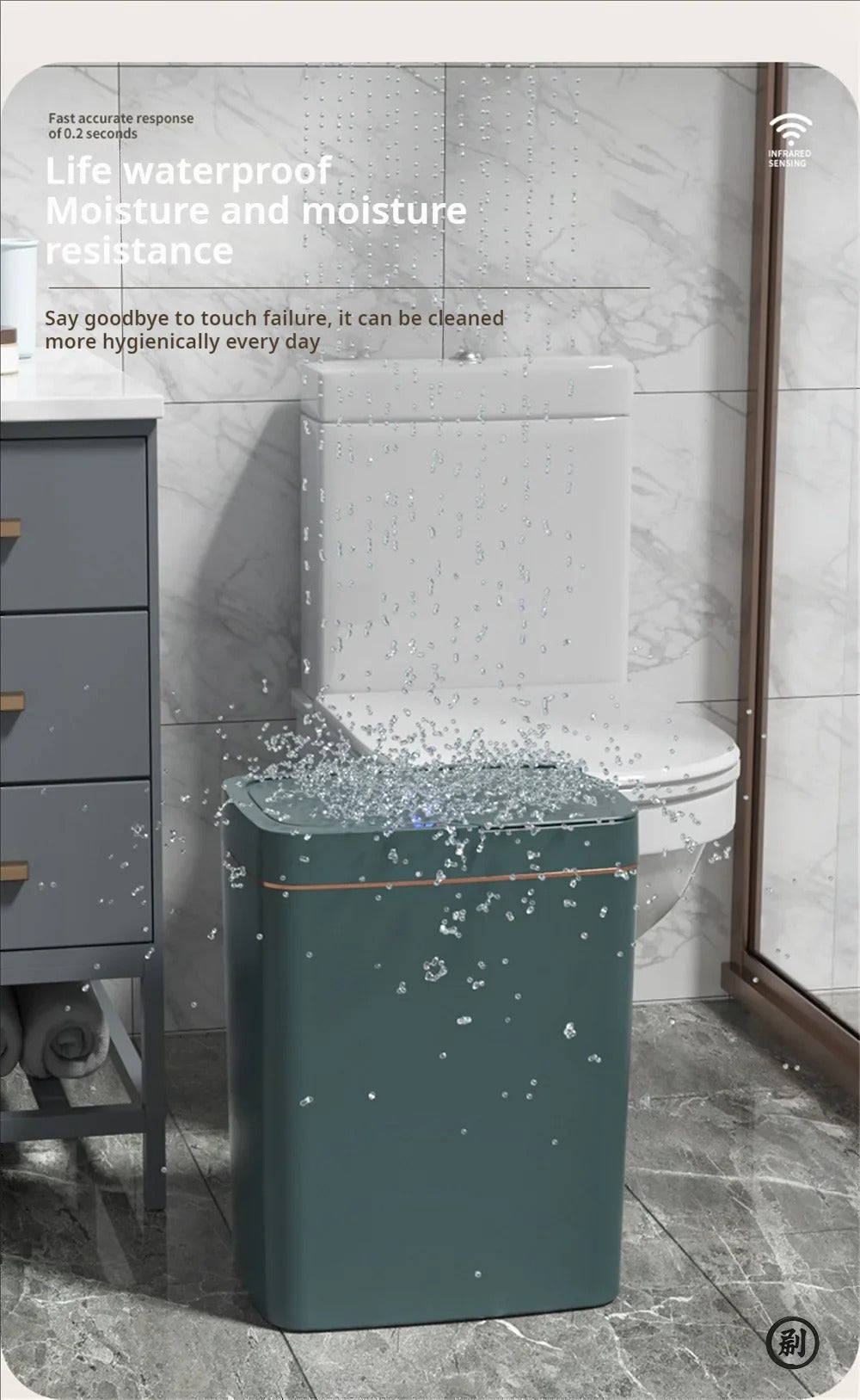 An elegant smart bathroom trash bin with a sleek, matte finish, equipped with a motion sensor that triggers lid opening, and a built-in deodorizer vent for odor control.