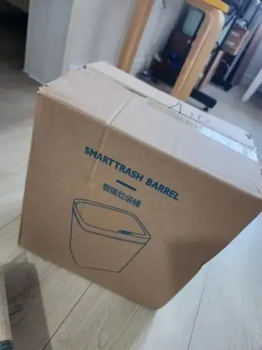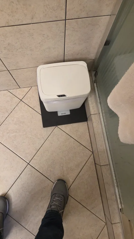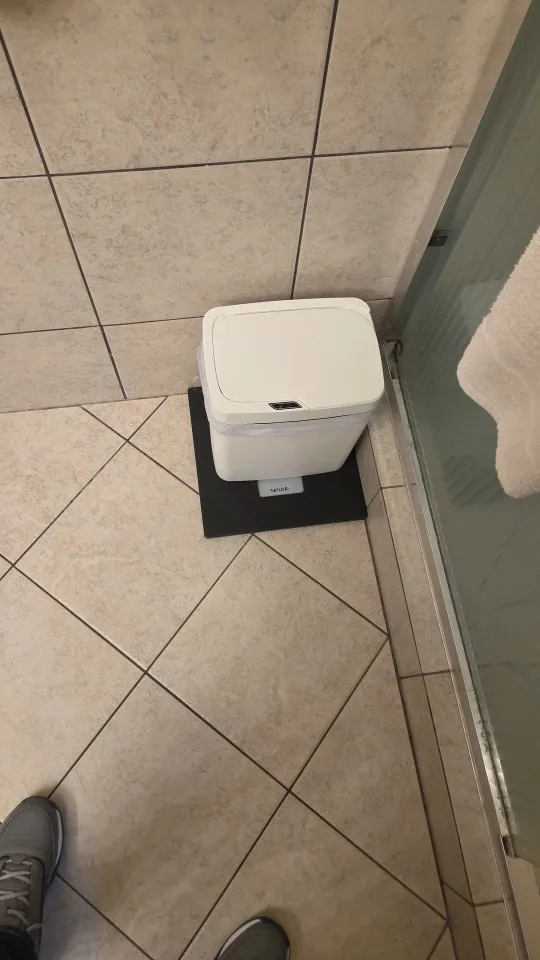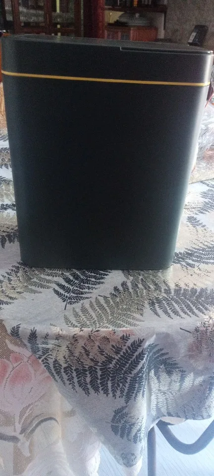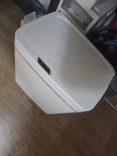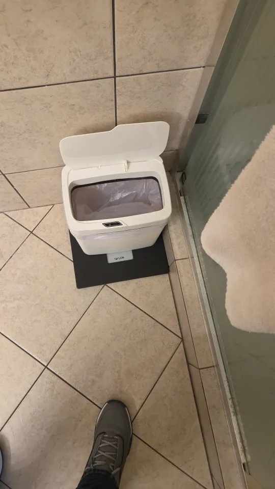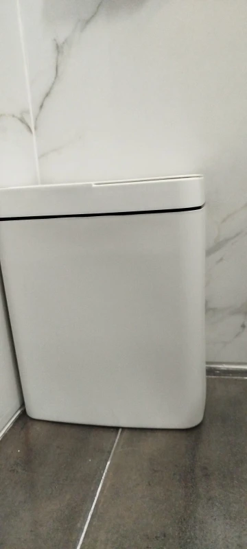An elegant smart bathroom trash bin with a sleek, matte finish, equipped with a motion sensor that triggers lid opening, and a built-in deodorizer vent for odor control.
